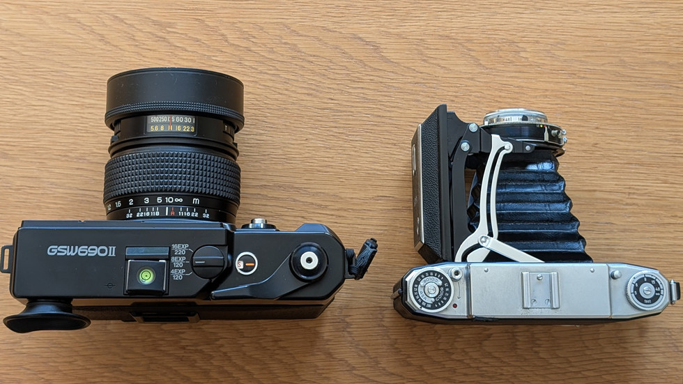 A size comparison of the Fuji GSW690 and the Zeiss Ikonta 6x9, folded and unfolded.